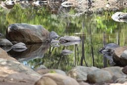The image depicts a serene natural setting, featuring a small creek or pond surrounded by rocks and vegetation. The water is calm with subtle ripples, and the reflection of greenery on the surface adds to the tranquil ambiance.