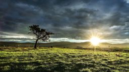 The image captures a serene sunset over a grassy field, illuminated by the glow of the setting sun. The sky is filled with dramatic clouds that appear to be a mix of dark gray and deep blue hues, suggesting an impending storm or change in weather. In the foreground, a solitary tree stands, its silhouette contrasting against the vibrant colors in the sky.
