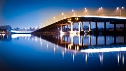 The image shows an urban scene at night, featuring a highway bridge over water. The sky is dark blue, indicating it's likely evening or nighttime. The lighting from the bridge illuminates the water below and reflects off the surface, creating a symmetrical pattern of lights on the water.