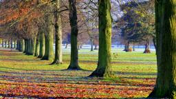 The image captures a serene autumn scene, featuring a pathway lined with trees whose leaves have turned a vibrant red. The sky is overcast, casting a soft light on the scene. A gate can be seen in the distance, partially obscured by the fall foliage.