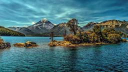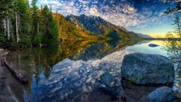 A serene lakeside view featuring a lush forest and clear water, with a majestic mountain range in the background under a blue sky.