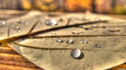 The image shows dew on a fallen leaf, possibly after a rainfall or morning mist. The leaf is slightly curved and lies flat with a few individual droplets visible on it.