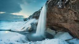 A dramatic image of a small, snowy waterfall cascading into a rocky valley. The sun is low in the sky, creating a silhouette effect and adding to the cold atmosphere. There are no people or animals visible in the photo.