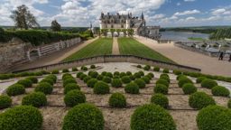 A grand castle with a well-manicured garden, featuring geometric-patterned hedges and pathways that lead to the front of the castle.