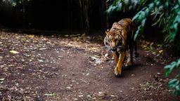 A majestic tiger walking towards the camera on a dirt path in what appears to be a wildlife reserve or zoo enclosure. The tiger's fur and features showcase its natural beauty, capturing attention with its powerful presence.