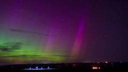 The image shows an aurora borealis illuminating the night sky, featuring bright greens and yellows typical of such natural light displays. The horizon is visible in the lower part of the photo with hints of landscape or man-made structures.