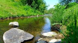 The image depicts a serene natural scene featuring a small rocky stream surrounded by grass and shrubbery. The creek flows gently through the center of the frame, with the rocks lining its banks on both sides. It's a sunny day with clear skies, suggesting it might be spring or summer season. There is no human activity visible in the image.