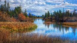 Autumn foliage surrounding body of water, with reflection on surface.