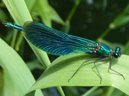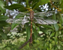The image shows a close-up of a dragonfly perched on green leaves against a blurred background, highlighting the details of its wings and body.