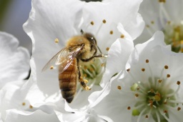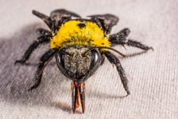 The image shows a close-up of a bee sitting on what appears to be a flower, possibly covered in pollen or some type of yellow substance.