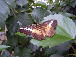 This is an image of a butterfly perched on a leaf. The butterfly has brown and white coloration with distinctive wing patterns.