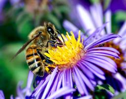 The image depicts a bee perched on a plant that appears to have pink flowers. The bee has a distinctive color pattern of black, yellow, and white stripes across its body.