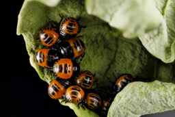 The image shows a large group of ladybugs congregating on a leafy green plant, which appears to be lettuce or cabbage given the texture and shape. The ladybugs have their red wings closed over their bodies as they are either resting or crawling. Their heads are visible where you can see their small, dark eyes and antennae.