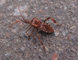 The image depicts a close-up view of a red bug, possibly a beetle or an insect with a shiny body and long antennae, resting on what appears to be a textured surface such as pavement. The bug has six legs, two wings, and is facing downwards with its underside exposed.