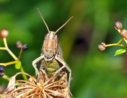 A close-up photo of a grasshopper perched on a plant, with its wings partially extended and antennae pointing outward.