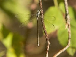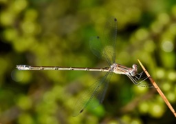 The image is of a dragonfly perched on a stick or twig, which is placed against a dark background that could be the bark of a tree. The dragonfly has delicate wings and long antennae. The focus of the photo is on the insect, capturing its details clearly.