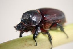 The image shows a single beetle sitting on a banana peel. The beetle is dark red in color and appears to have a shiny exoskeleton, indicating it may be wet or recently emerged from water. It has six legs that are visible and two antennae at the head, which are used for sensing its environment.