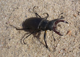 A large, dark insect with extended mandibles and wings, sitting on sandy ground.