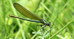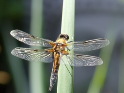 This is an image of a dragonfly perched on what appears to be a plant stem or leaf with green and black vegetation in the background, possibly indicating a natural habitat.