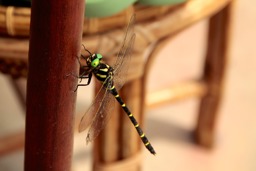 A small, brightly colored dragonfly with blue and yellow wings perched on the edge of a wicker table.