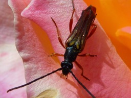 Close up of a bee, possibly a ladybug or some other type of insect, feeding on nectar from a flower petal.
