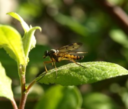 The image shows a close-up of a yellow and black insect, which appears to be a fly or bee, perched on the edge of a leaf. The background is blurred but suggests a natural environment with green foliage.