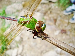 This image features a vibrant green dragonfly perched on a wooden stick in an outdoor setting, with the background showing natural elements.