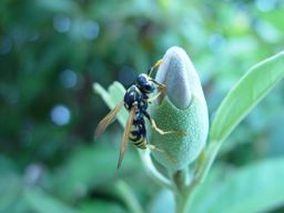 The image shows a bee close up, likely a type of wasp given its black body with yellow markings on the head and abdomen, which are characteristic of many species that fall under the term 'wasp' in colloquial usage.