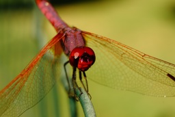 A dragonfly perched on a plant stem with vibrant red coloration on its wings and body, set against a green natural backdrop.