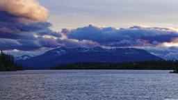 The image shows a serene landscape at either sunrise or sunset, given the warm hues in the sky and the reflection on the water. The scene includes mountains, likely part of a mountain range, with clouds scattered across the sky. In front of the mountains is a body of water that appears calm. There are no visible people or man-made structures in the image, emphasizing the natural beauty of the environment. The style of the image suggests it may have been taken during travel, possibly for recreation or to capture a memorable moment.