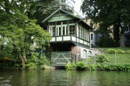 The image shows a quaint wooden house situated by a canal or river, surrounded by greenery such as trees and grass. The house has a distinctive Swiss-style design with ornate woodwork on the facade, including decorative brackets and shutters. It appears to be in a rural or suburban setting, possibly in Europe due to the architectural style.