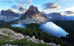 The image depicts a serene mountainous landscape, featuring a clear blue lake nestled at the base of majestic mountains. The foreground is adorned with coniferous trees and shrubs. The sky above is partly cloudy, suggesting fair weather conditions.