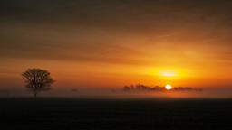 The image captures a tranquil sunset scene in what appears to be an open field or meadow. The sky is a rich, deep orange hue, and the horizon line subtly divides the sky from the misty ground below. In the center of the frame stands a lone tree with bare branches, suggesting it might be autumn or winter. There are no texts or people visible in the image, giving it a serene and peaceful atmosphere.