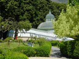 The image displays an outdoor botanical garden or greenhouse, likely located in Italy due to the style of the architecture and the design of the building. The scene is daylight with clear visibility. It shows a path leading towards the main entrance or exit of the facility, which is dome-shaped and features a decorative structure on top that could be part of its architectural detail.