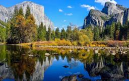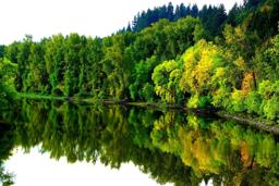 An image of a serene outdoor scene, featuring a calm lake with a reflection of a forest and mountains, taken during the daytime.