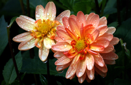 The image shows two brightly colored flowers, possibly daisies or similar type of flowers, with vibrant yellow and orange centers surrounded by delicate petals. The leaves behind the flowers appear fresh and green. Raindrops are visible on the petals, adding a touch of sparkle to the scene. The image is naturalistic and captures the beauty of floral subjects in an outdoor setting.