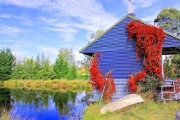 The image features a quaint, weathered blue shed with red ivy climbing its exterior walls. The shed is situated on the edge of a body of water, possibly a lake or pond, given the calm and serene reflection visible in the water. Surrounding the shed are green trees and foliage, suggesting a rural or semi-rural setting. The sky above is partly cloudy, indicating fair weather conditions.