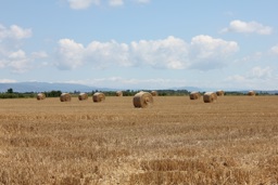 The image depicts a rural field scene, with several bales of hay neatly stacked against each other in the foreground. The background features a line of trees and a clear sky above. The overall atmosphere is serene and natural.