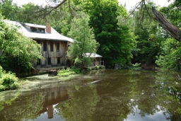 The image depicts a serene rural setting, featuring a collection of log cabins and a body of water that could be a pond or a river reflecting the surrounding vegetation. The sky is clear with visible sunlight casting shadows on the ground, suggesting it's daytime. There are no people visible in the image, and the overall atmosphere is calm and peaceful.