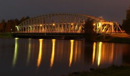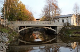 The image depicts a quaint stone bridge spanning over a small, flowing body of water with rocks and greenery surrounding it. The sky is partly cloudy, suggesting a bright but not harsh day. The bridge has an arched design typical of traditional European construction.