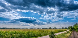 A daytime scene with clouds and sunlight, featuring a path through an open field with tall crops. The sky is partly cloudy, transitioning from the warm hues of the low sun to the cooler tones above. There are no people or animals visible in this serene, rural landscape.