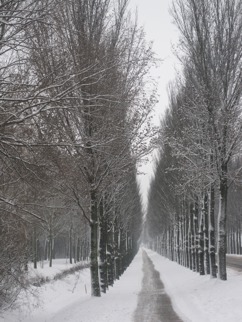 A snowy pathway between two lines of trees, possibly leading to a building on a sunny winter day.