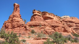The image shows a red rock formation, likely located in a desert landscape. The rocks have a reddish hue and appear to be jagged, with some greenery visible among them.