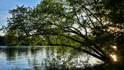The image shows a serene scene at sunset with trees reflecting on water, suggesting it could be a lake or river. The sky is clear with warm hues indicative of the setting sun. There are no people visible in the picture.