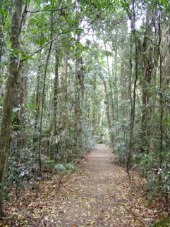 The image shows a natural, dense forest with an unpaved path that leads through it. The vegetation is lush and green, typical of a tropical rainforest environment. There is no visible human activity or any signs of danger in the image.
