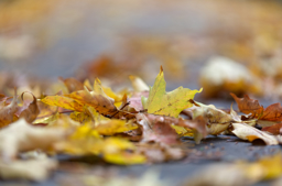 The image shows an autumn scene featuring dried, fallen leaves scattered on a surface that appears to be wet from rain or water. The leaves vary in color, with shades of orange, yellow, and brown, indicative of the changing season. The focus is on the foreground where the leaves are close-up and sharply in focus, while the background fades into a soft blur. The overall atmosphere is serene and reflective, capturing the essence of autumn's transition into winter.