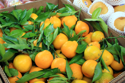 The image displays a variety of citrus fruits, including oranges and possibly other types of fruit. The fruits are arranged in boxes with leaves attached to them, suggesting they have been freshly harvested and are being displayed for sale.