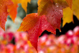 The image captures a close-up view of colorful maple leaves, showcasing their vibrant autumn colors and drops of water on them, possibly from a recent rain or dew.
