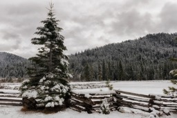 A wintry forest scene, featuring a snow-covered evergreen tree and fence in the foreground with mountains in the background under cloudy skies.