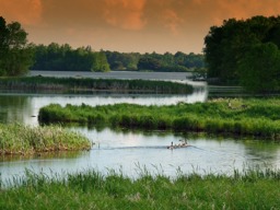The image displays a tranquil scene of a marshy area at sunrise or sunset, with reflections of light on the water surface, indicating a calm and serene environment. The sky is orange in color, suggesting either early morning or late evening hours. Wildlife, specifically ducks, can be observed swimming near the bank, indicating that this habitat supports aquatic life. Surrounding the marsh are trees and shrubbery, contributing to a natural landscape.